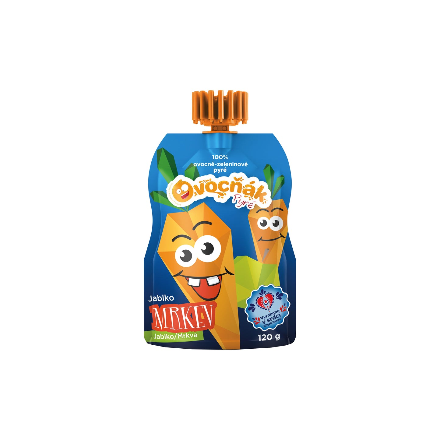 Toto ovocné pyré obsahuje čistý protlak z jablek a mrkví bez přidaného cukru či jiných přísad v praktické kapsičce. Ovoce i zelenina jsou pro výrobu pečlivě vybírány, pochází z certifikovaných sadů a od prověřených pěstitelů. Na těchto 120 g bylo zpracováno 160 g čerstvých jablek a mrkví. Je vhodné pro kojence od dokončeného 5. měsíce věku. Chuť a barva se může lišit v závislosti na odrůdě surovin a ročním období. Kapsičku můžeme přibalit také dětem do školy jako zdravou svačinku. Každé víčko kapsiček Ovocňák je dílek stavebnice. Posbírejte je a pusťte se do hry. Začněte skládat, spojovat a kombinovat. Své výtvory pak můžete vyfotit a pochlubit se jimi. Společnost Ovocňák pravidelně vyhlašuje soutěže o nejkreativnější výtvory, které oceňuje věcnými cenami.