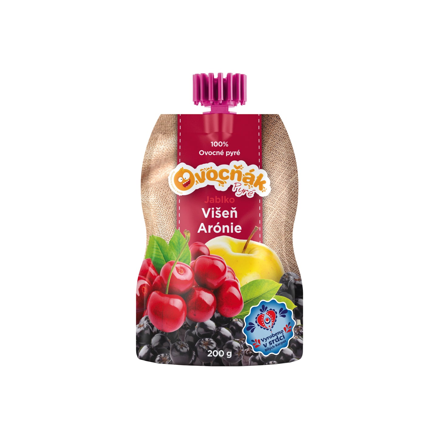 Toto ovocné pyré obsahuje čistý protlak z jablek, višní a arónie bez přidaného cukru či jiných přísad v praktické kapsičce. Ovoce je pro výrobu pečlivě vybíráno, pochází z certifikovaných sadů a od prověřených pěstitelů. Na těchto 200 g bylo zpracováno 260 g čerstvých jablek, hrušek a arónie. Je vhodné pro kojence od dokončeného 5. měsíce věku. Chuť a barva se může lišit v závislosti na odrůdě surovin a ročním období. Kapsičku můžeme přibalit také dětem do školy jako zdravou svačinku. Každé víčko kapsiček Ovocňák je dílek stavebnice. Posbírejte je a pusťte se do hry. Začněte skládat, spojovat a kombinovat. Své výtvory pak můžete vyfotit a pochlubit se jimi. Společnost Ovocňák pravidelně vyhlašuje soutěže o nejkreativnější výtvory, které oceňuje věcnými cenami.