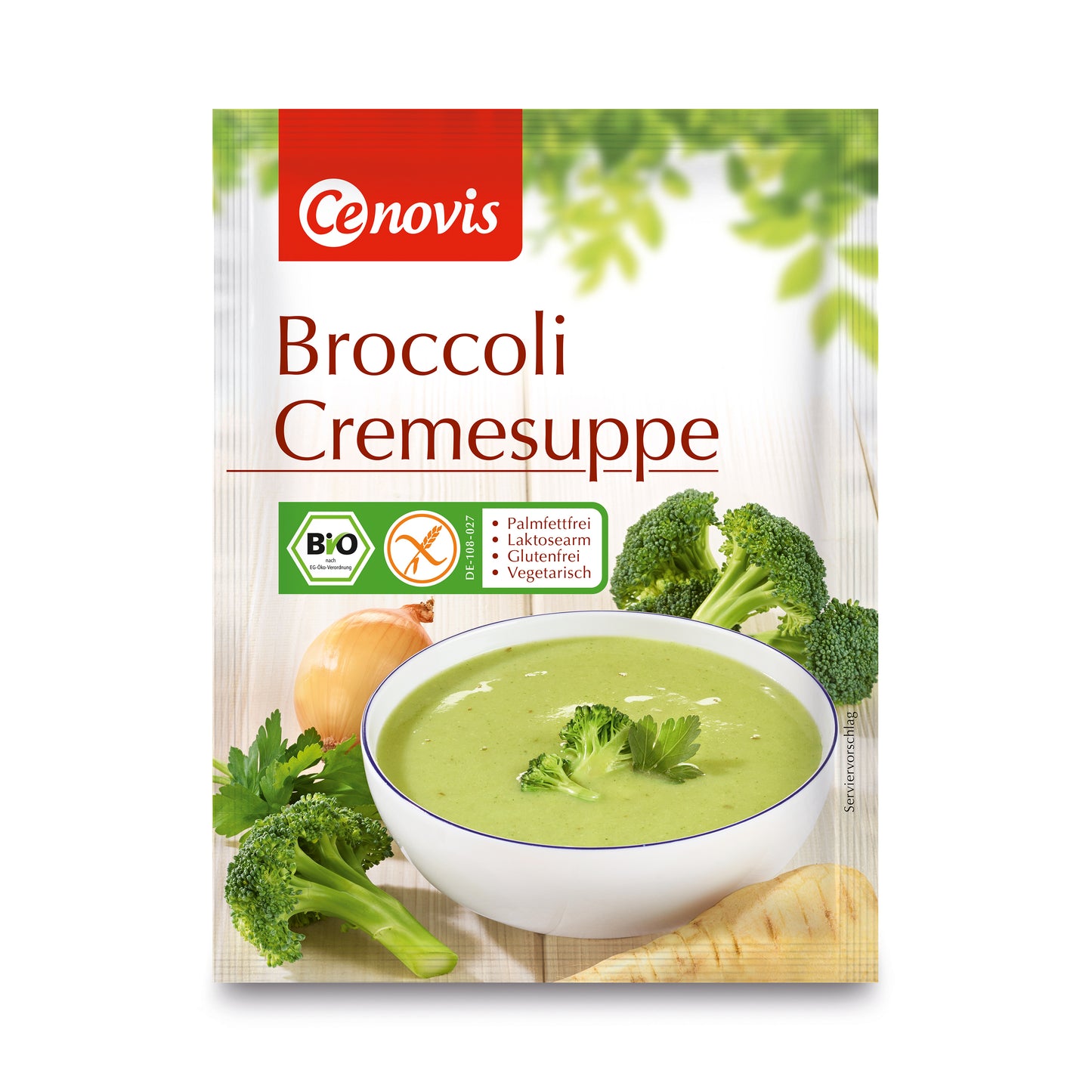 SUŠENÉ ODSTŘEDĚNÉ MLÉKO S NÍZKÝM OBSAHEM LAKTÓZY*, rýžová mouka*, škrob*, mořská sůl, brokolice* 8 %, kvasničný extrakt, maltodextrin*, pastinák* 1,8 %, cibule* 1,3 %, zahušťovadlo (karubinka)*, slunečnicový olej*, petržel*, kurkuma*, listy libečku*, muškátový květ*, kůra z muškátového oříšku*.*produkt kontrolovaného ekologického zemědělství